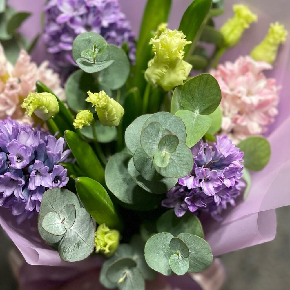 Гиацинт – 5 шт.Эвкалипт Baby Blue – 7 шт.Упаковка – 3 шт.Лента атласная – 3 шт.