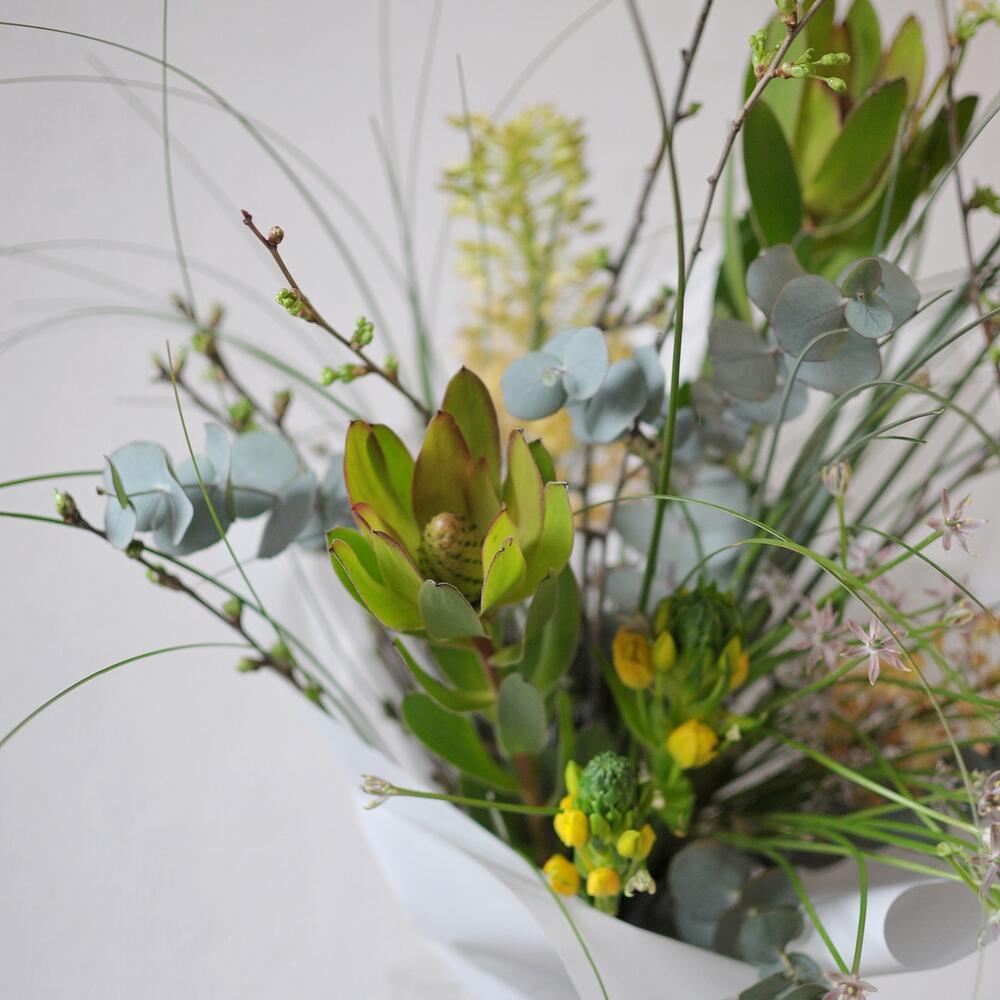 леукондендрон – 2 шт.Орнитогалум – 2 шт.Эвкалипт – 4 шт.Прунус – 3 шт.Берграсс – 3 шт.эремурус – 2 шт.Упаковка – 1 шт.Лента атласная – 1 шт.