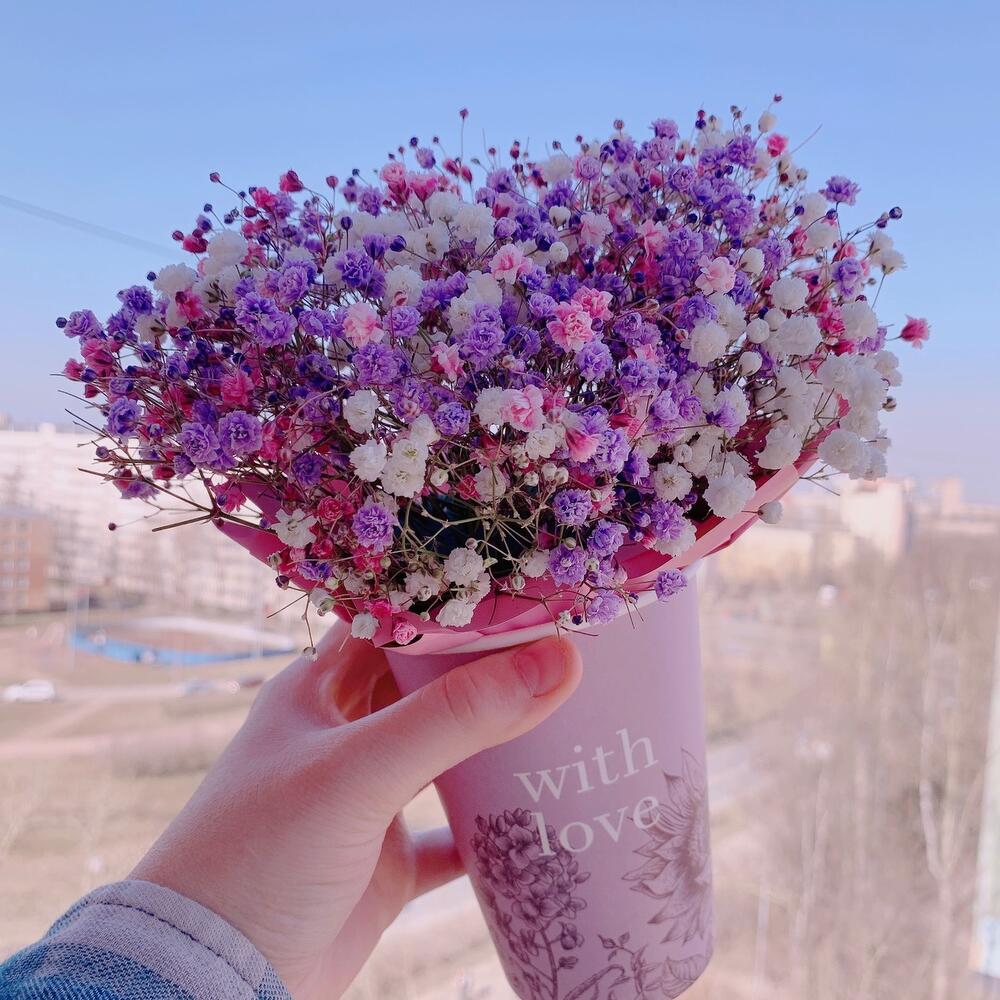 Очаровательная композиция из изысканных свежих цветов.Наполнена множеством соцветий радужной гипсофилы. Собрана в стильном бумажном стакане Композиция из гипсофилы – необычный подарок, который удивит своей невероятной стойкостью, при правильном и простом уходе.❤ Ставить композицию в прохладном месте, избегая отопительных приборов и прямых солнечных лучей. ❤ Подливать немного воды в серединку. Гипсофила не вянет, а становится сухоцветом, сохраняя свой вид. Поэтому композиция продолжит радовать ещё очень долго! Почему выбирают нас? – Работаем на качество. – Бережно упакуем в транспортировочную пленку, чтобы защитить во время доставки от любых погодных условий. – Приложим инструкцию, как правильно ухаживать за цветамиСохраняйте товар в подборках, чтобы не потерять