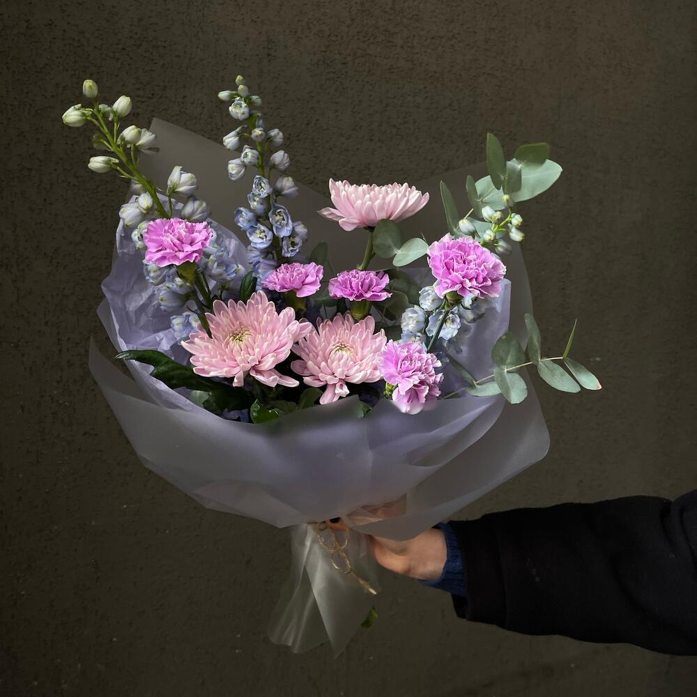 Дельфиниум – 3 шт.Эвкалипт – 2 шт.Хризантема – 3 шт.Гвоздика – 5 шт.Упаковка дизайнерская – 3 шт.