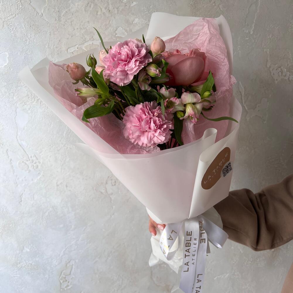 Альстромерия – 1 шт.розакустовая – 1 шт.Роза пионовидная – 1 шт.Диантус – 3 шт.Упаковка дизайнерская – 1 шт.
