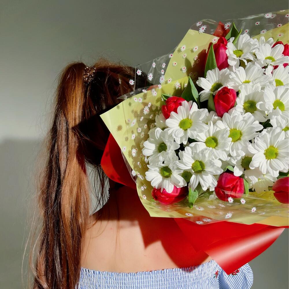 Тюльпан – 7 шт.Хризантема кустовая – 3 шт.Упаковка – 1 шт.