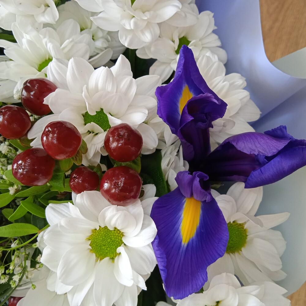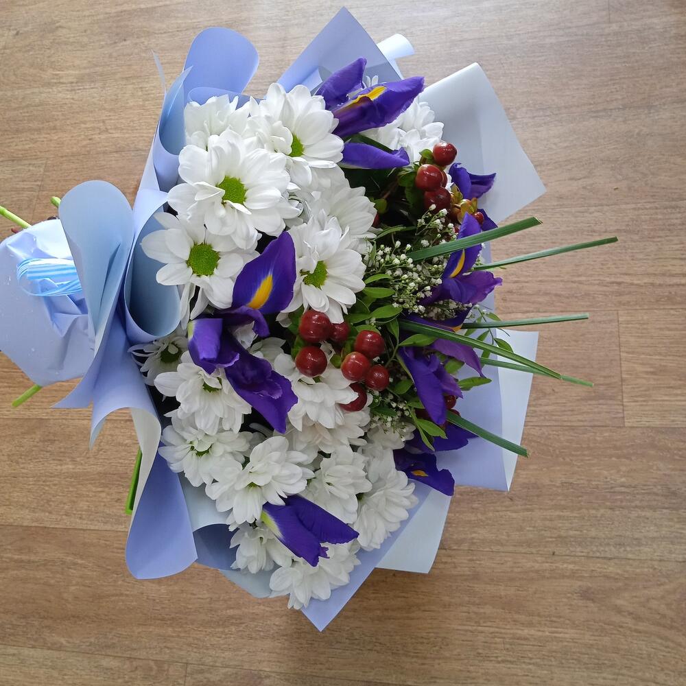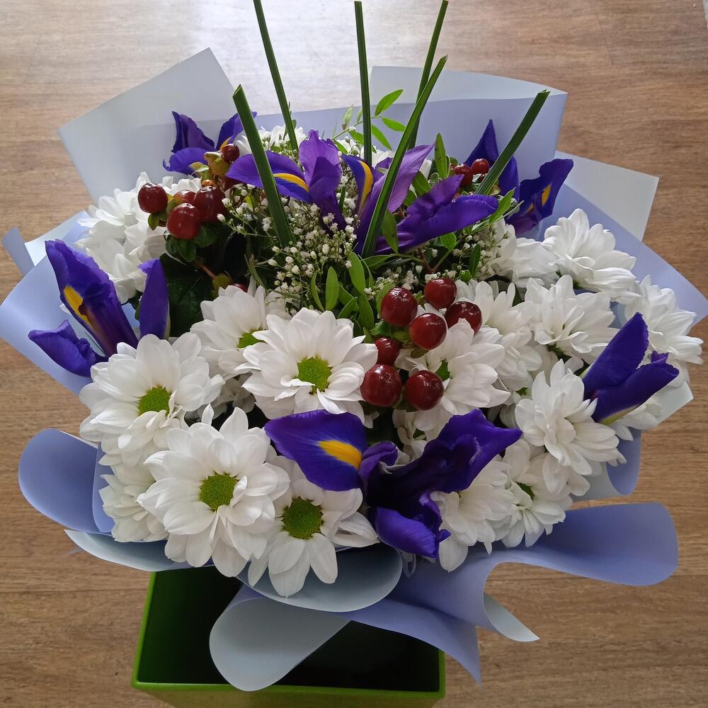 Ирис Blue Magic – 6 шт.Хризантема кустовая – 5 шт.Гиперикум красный КУСТОВОЙ – 3 шт.Гипсофила – 1 шт.Фисташка пучок – 1 шт.Упаковка дизайнерская – 1 шт.Лента – 1 шт.