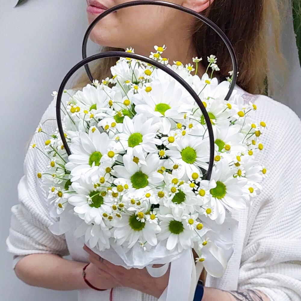 Лента атласная – 2 шт.Тишью – 2 шт.Хризантема Ромашковая – 4 шт.Открыточка с вашими пожеланиями – 1 шт.Оазис флористический – 1 шт.транспортировочная упаковка – 1 шт.танацетум ромашка – 5 шт.