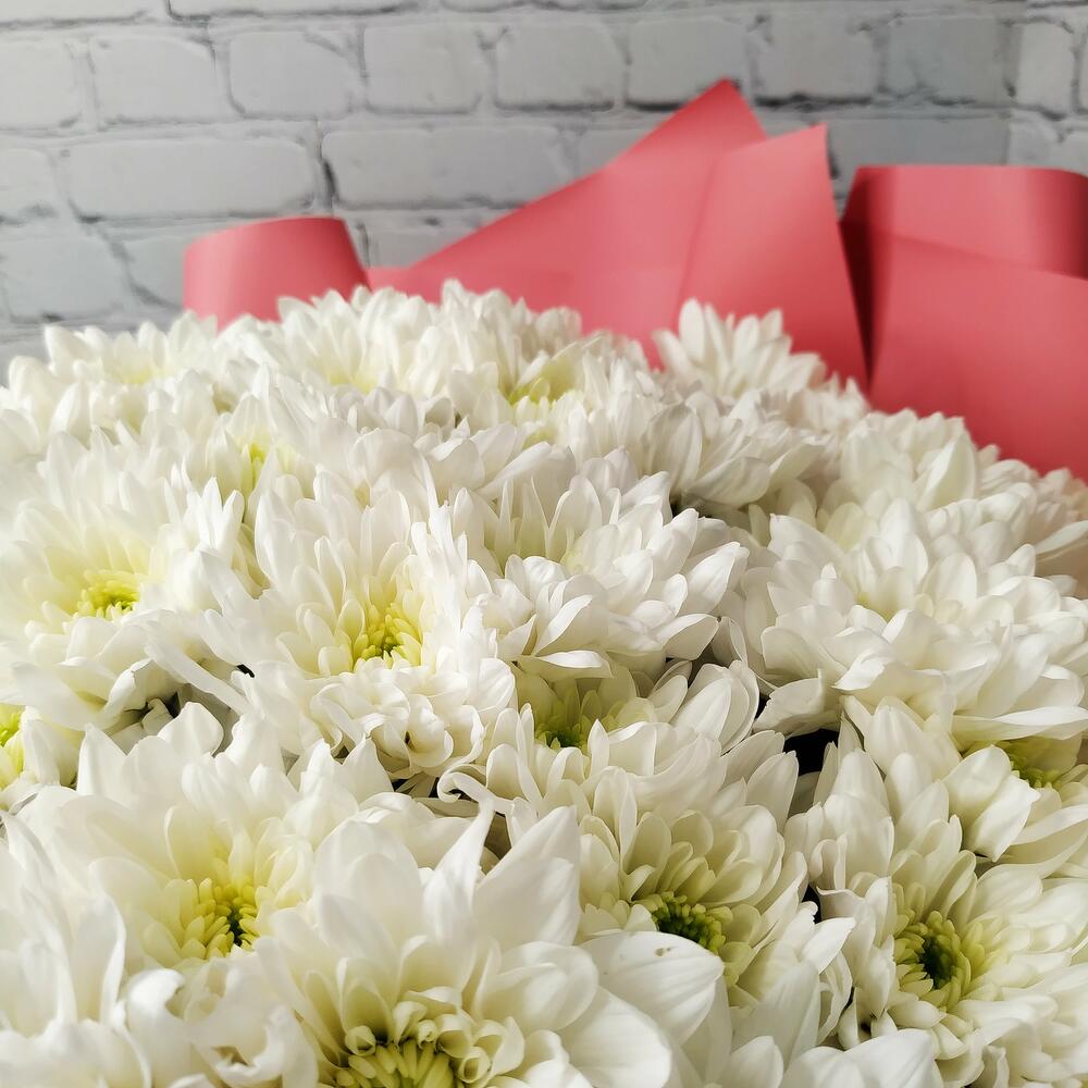 Прекрасный букет из белых хризантем, станет идеальным подарком для самых любимых и близких!Памятка для букета:1. Чистая вода раз в сутки.2. Стебли подрезаем на 0,5см при каждой смене воды.3. Ставим в прохладное место, но не у окна.4. Чтобы вода оставалась свежей, не допускайте попадания листьев и лепестков в воду.Друзья, обратите внимание, что цвет упаковки может быть другим, в зависимости от наличия на складе.