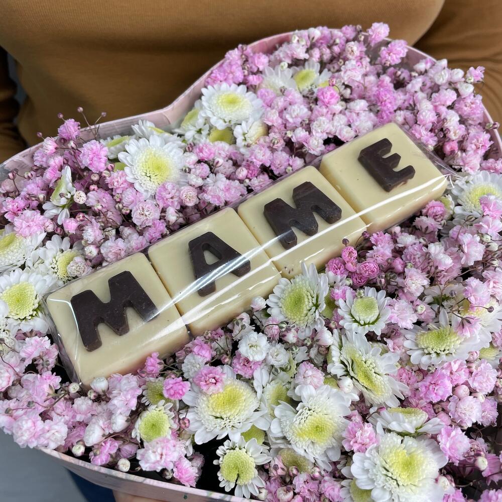 Коробка-сердце – 1 шт.Оазис – 1 шт.Хризантема сталион – 3 шт.Гипсофила розовая – 3 шт.Буквы шоколадные – 4 шт.