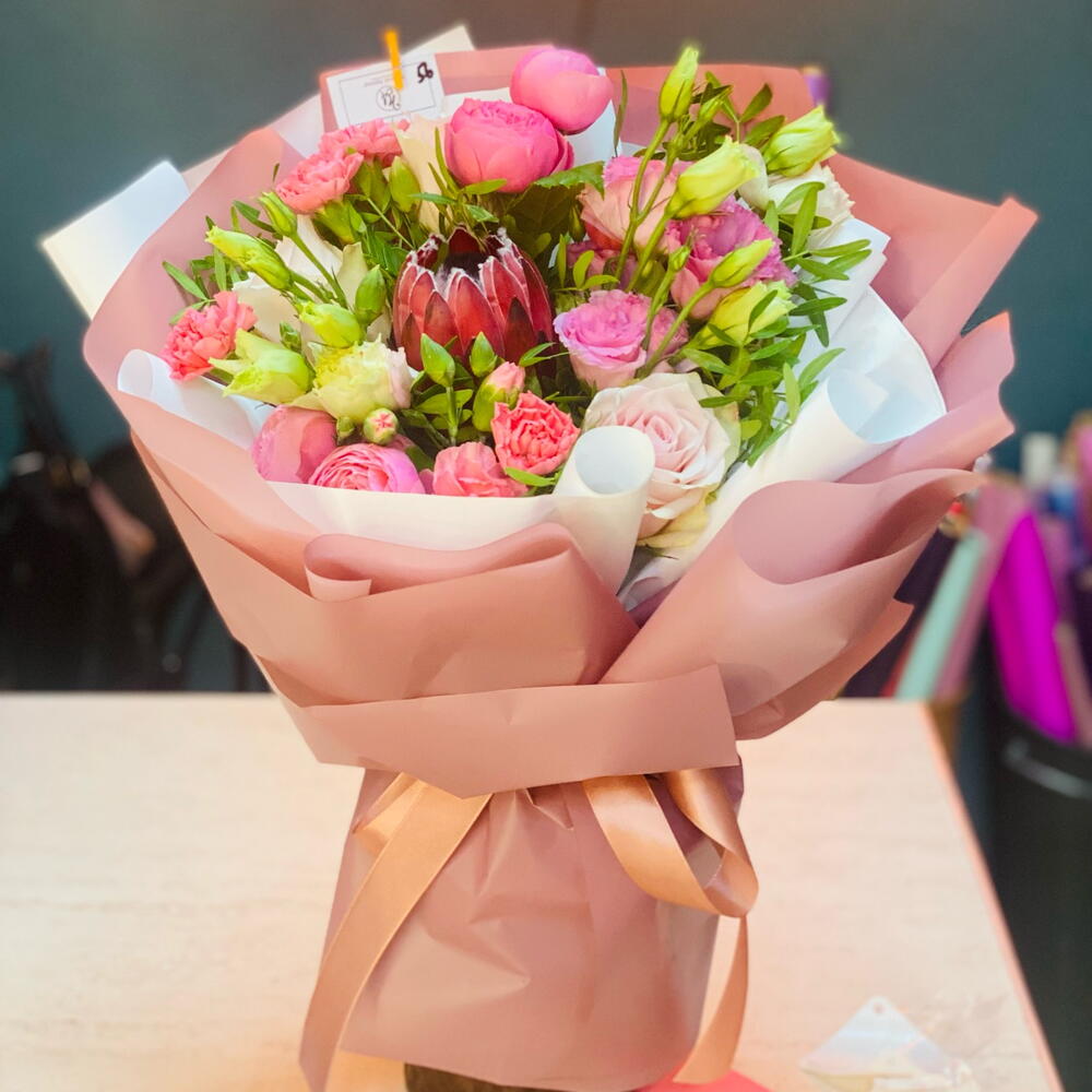 Протея – 1 шт. эустома екстра – 3 шт. спрей сілва пінк – 3 шт. пінк атена – 3 шт. діантус рожевий – 3 шт. фісташка флористична – 3 шт. оформлення букета в упаковка – 1 шт.