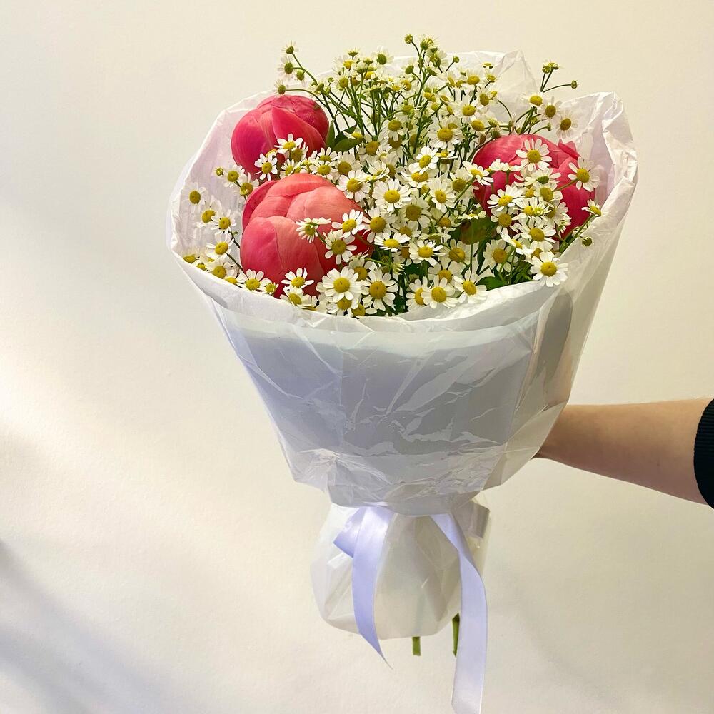 Пион коралл шарм – 3 шт.Матрикария – 5 шт.Упаковка дизайнерская – 1 шт.