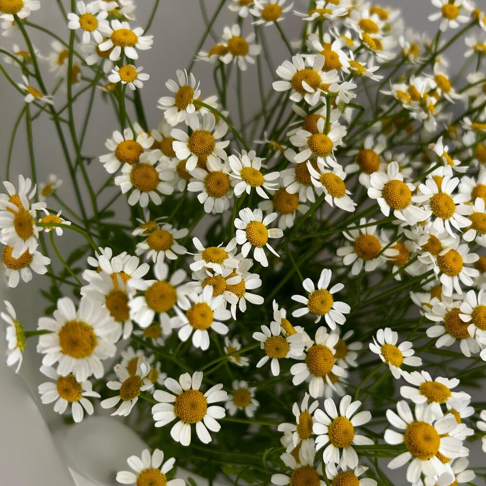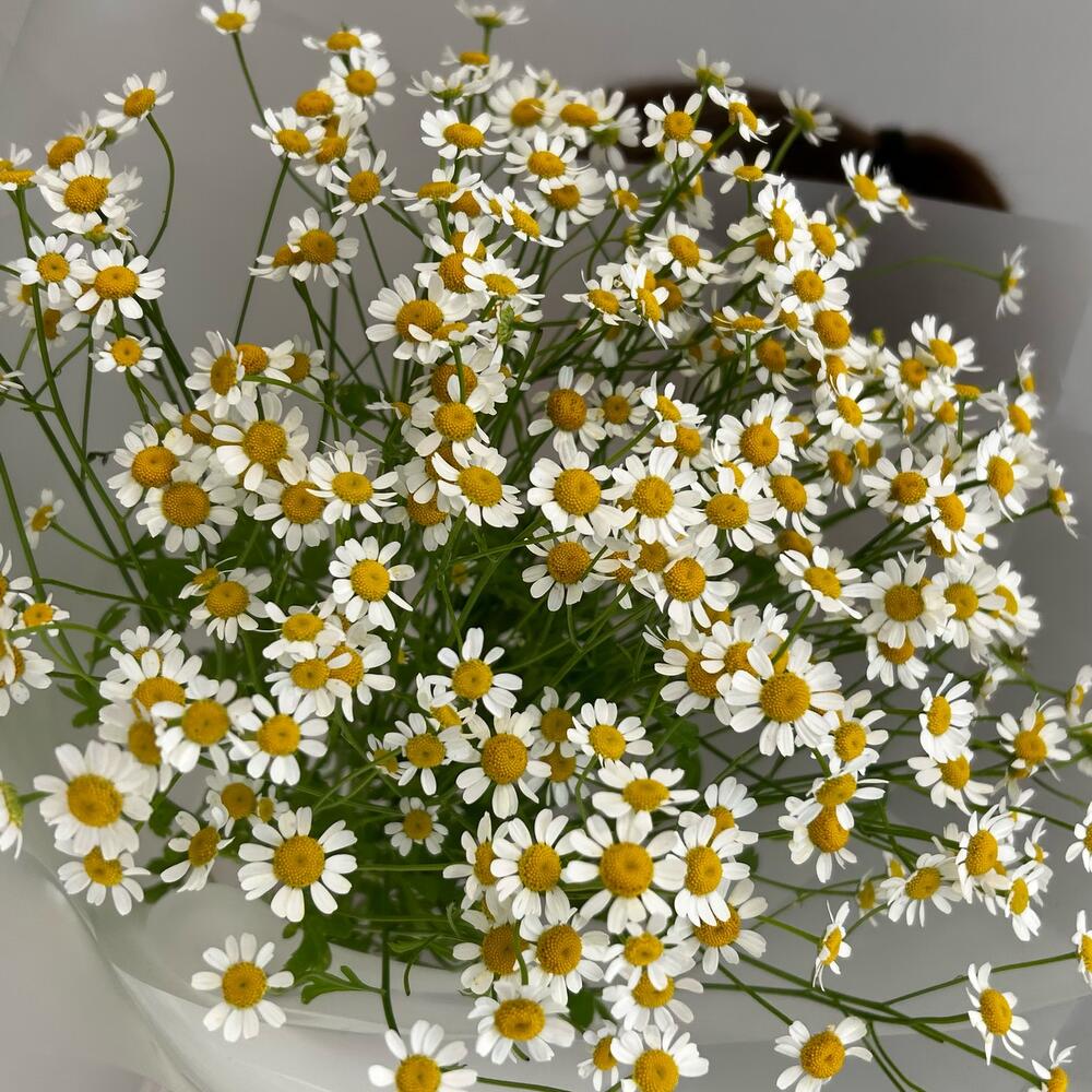 Лента атласная – 2 шт.Упаковка дизайнерская – 3 шт.ромашка кустовая танацетум – 9 шт.