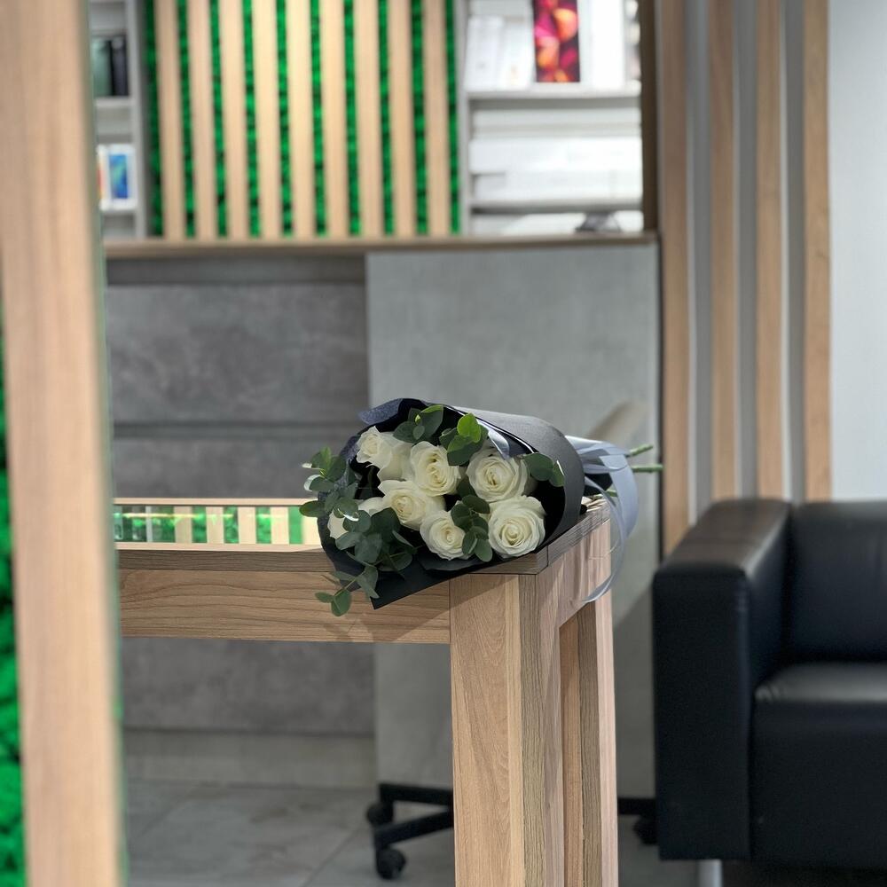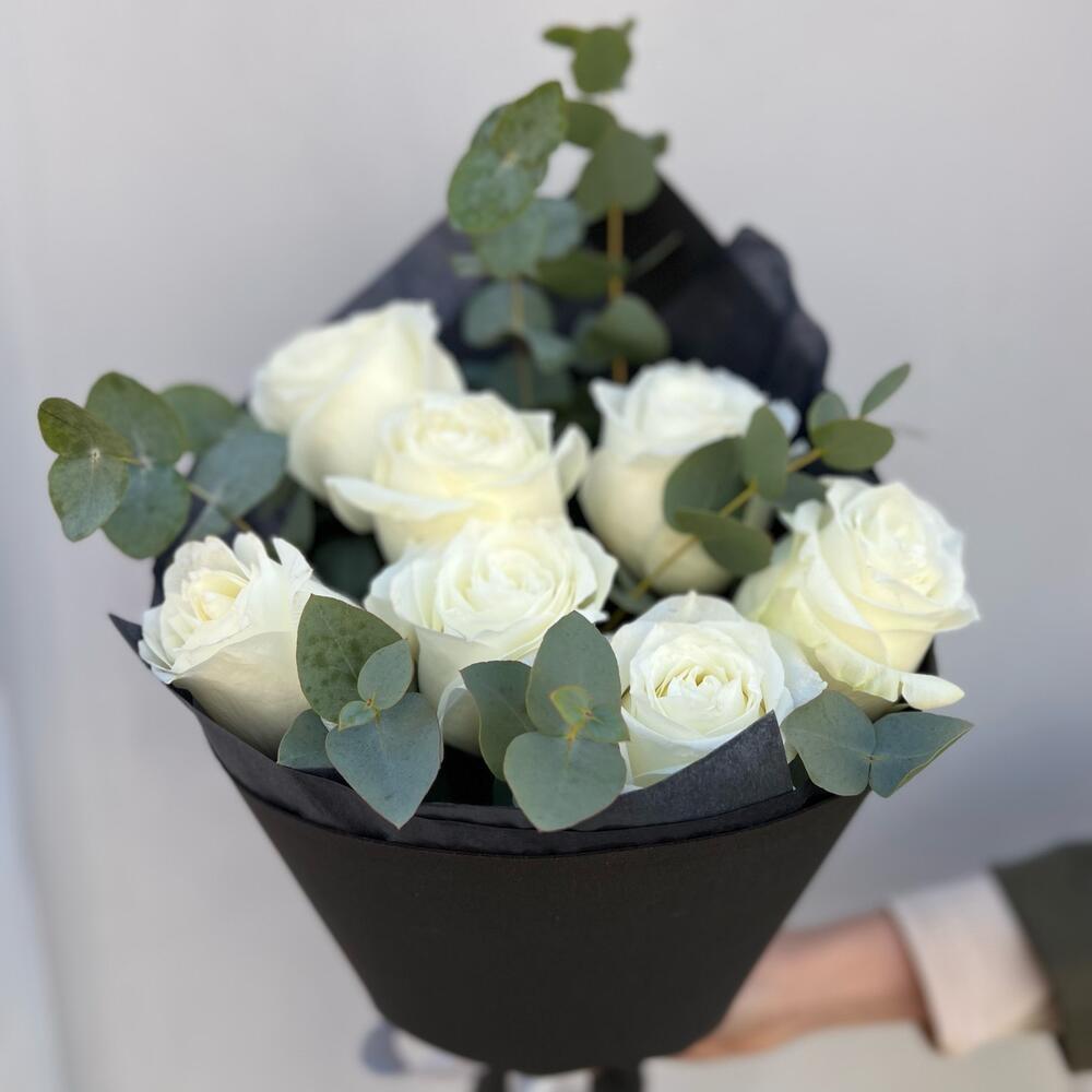 Эвкалипт – 2 шт.Лента атласная – 1 шт.Тишью – 1 шт.Роза белая – 7 шт.Фоамиран (упаковка) – 1 шт.