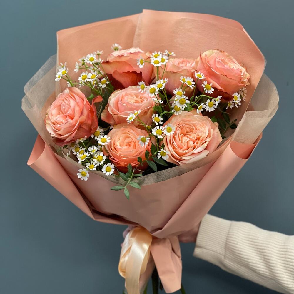 Лента – 1 шт.Роза одноголовая – 7 шт.Матрикария – 3 шт.Фисташка – 3 шт.Упаковка дизайнерская – 1 шт.