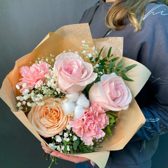 Роза Эквадор – 3 шт.Диантус – 2 шт.Хлопок – 1 шт.Гипсофила – 2 шт.Зелень – 3 шт.Упаковка дизайнерская – 3 шт.Лента атласная – 1 шт.