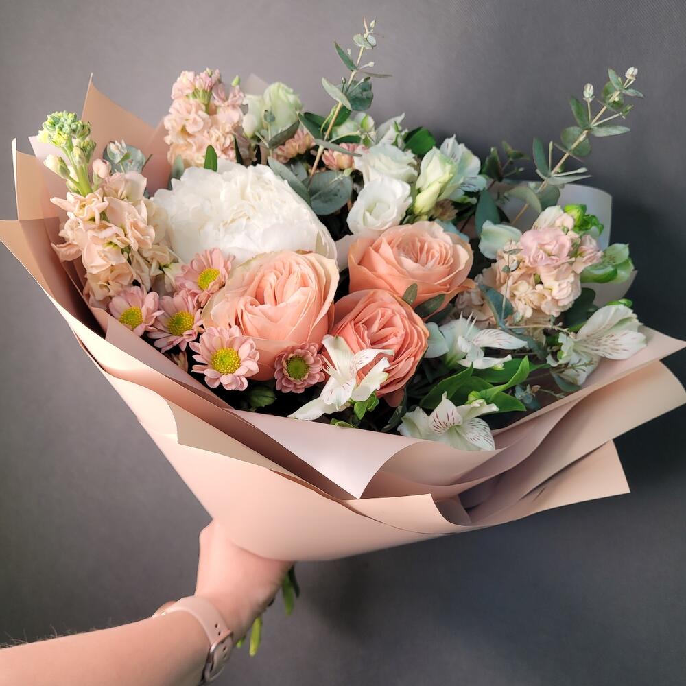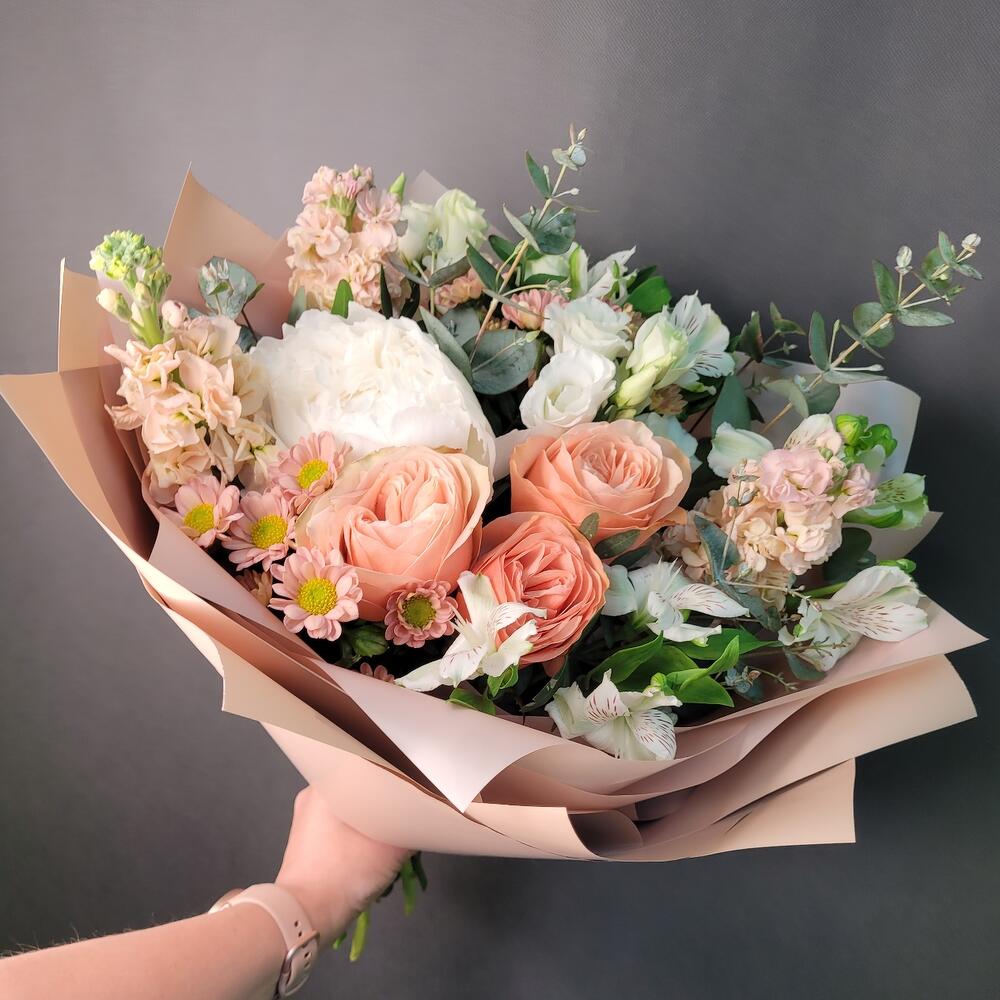 Роза Эквадор – 3 шт.Маттиола – 3 шт.Пион – 1 шт.Альстромерия – 3 шт.Сантини – 2 шт.Эустома – 2 шт.Эвкалипт – 2 шт.Упаковка дизайнерская – 1 шт.Лента атласная – 1 шт.