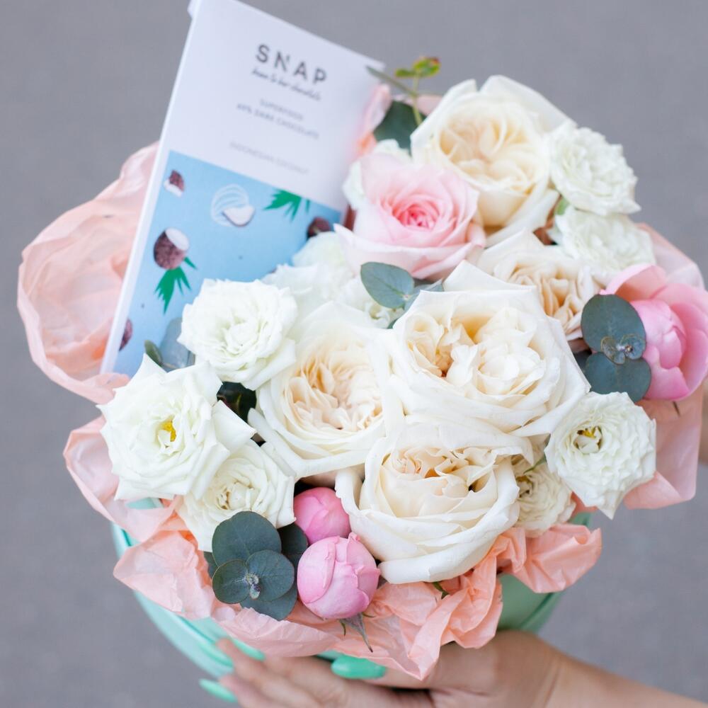 Роза – 4 шт.Роза кустовая – 3 шт.Эвкалипт – 3 шт.шоколад snap – 1 шт.