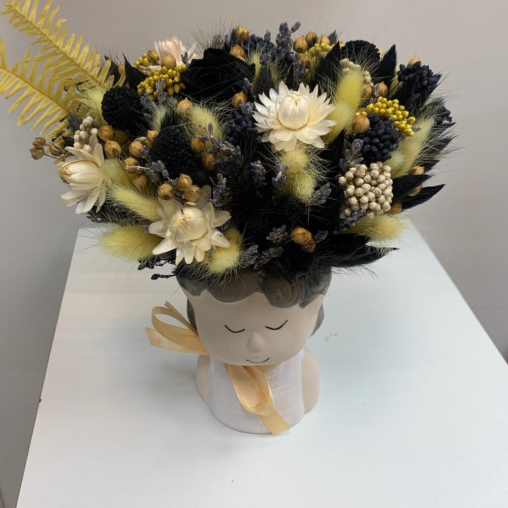 Кашпо керамическое – 1 шт.Лагурус (сухоцвет) – 75 шт.лен сухоцвет – 17 шт.Роза стабилизированная – 1 шт.Краспедия – 3 шт.Лаванда (сухоцвет) – 50 шт.Гелихризум – 5 шт.Озотамнус – 11 шт.папоротник стабилизированный – 2 шт.Лента атласная – 1 шт.