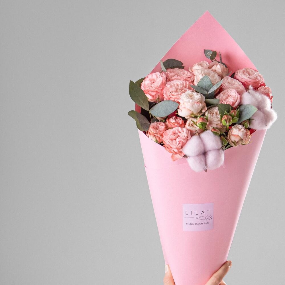 кустовые пионовидные розы – 19 шт. Упаковка дизайнерская – 1 шт. Оазис флористический – 1 шт. Эвкалипт – 2 шт. Открыточка с вашими пожеланиями – 1 шт.