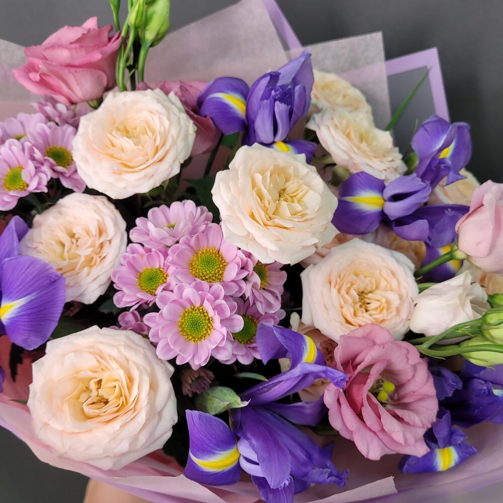 Роза кустовая – 2 шт.Ирис Blue Magic – 5 шт.Эустома – 2 шт.Сантини – 2 шт.Упаковка дизайнерская – 1 шт.Лента атласная – 1 шт.