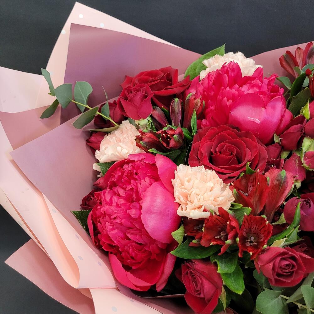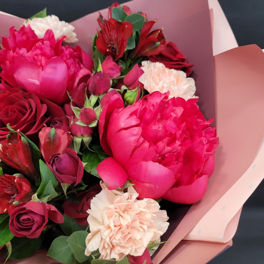 Гвоздики, Кустовые розы, Пионовидные розы, Розы