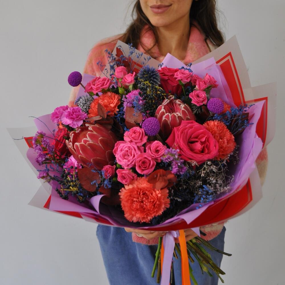 Очень яркий!Необычное сочетание экзотики и классики – протея, колючки, розы и гвоздики.Необычный букет для вашего получателя!Станет прекрасным подарком на день рождения, юбилей. Яркие краски как никогда лучше подходят для дарения в это время года)