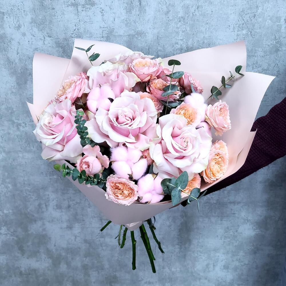 Альстромерии, Кустовые розы, Лизиантусы, Пионовидные розы, Розы, Ромашки