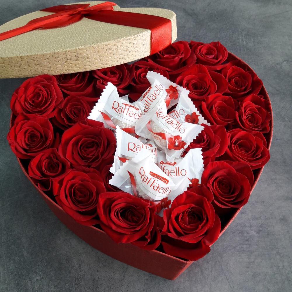 Роза красная – 21 шт. Коробка – 1 шт. Оазис – 1 шт. Раффаэлло – 1 шт.