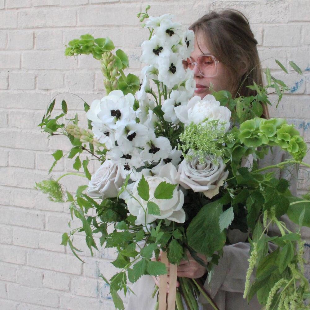 дельфиниумом – 3 шт.Амарант – 1 шт.ирландский колокольчик – 2 шт.Ветки малины – 4 шт.Тубероза – 2 шт.Роза Мента – 2 шт.Пион – 3 шт.Амми – 3 шт.Фисташка – 3 шт.Лента атласная – 1 шт.