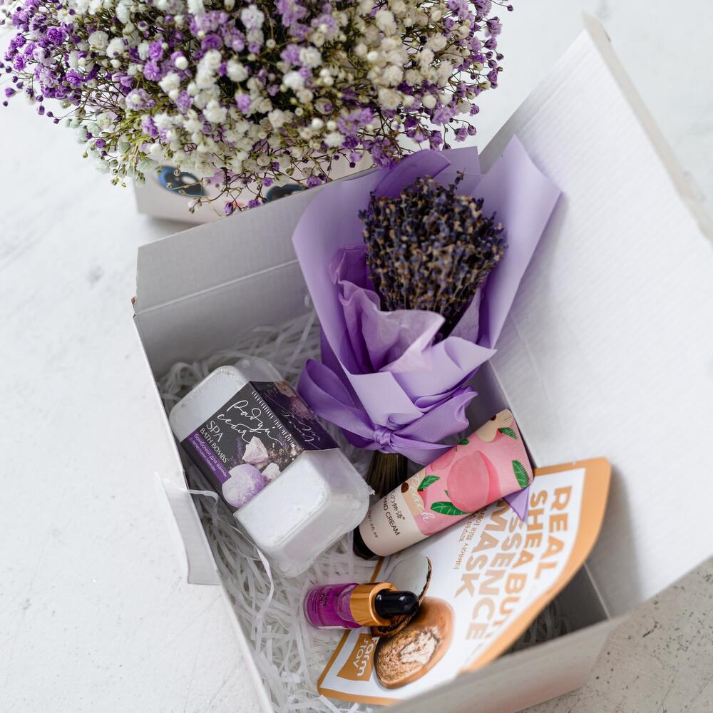 Очаровательный подарочный набор.В составе : маска для лица корейская, масло для кутикулы, цветочная композиция, букет лаванды , крем для рук, набор бомбочек для ванны, подарочная коробка