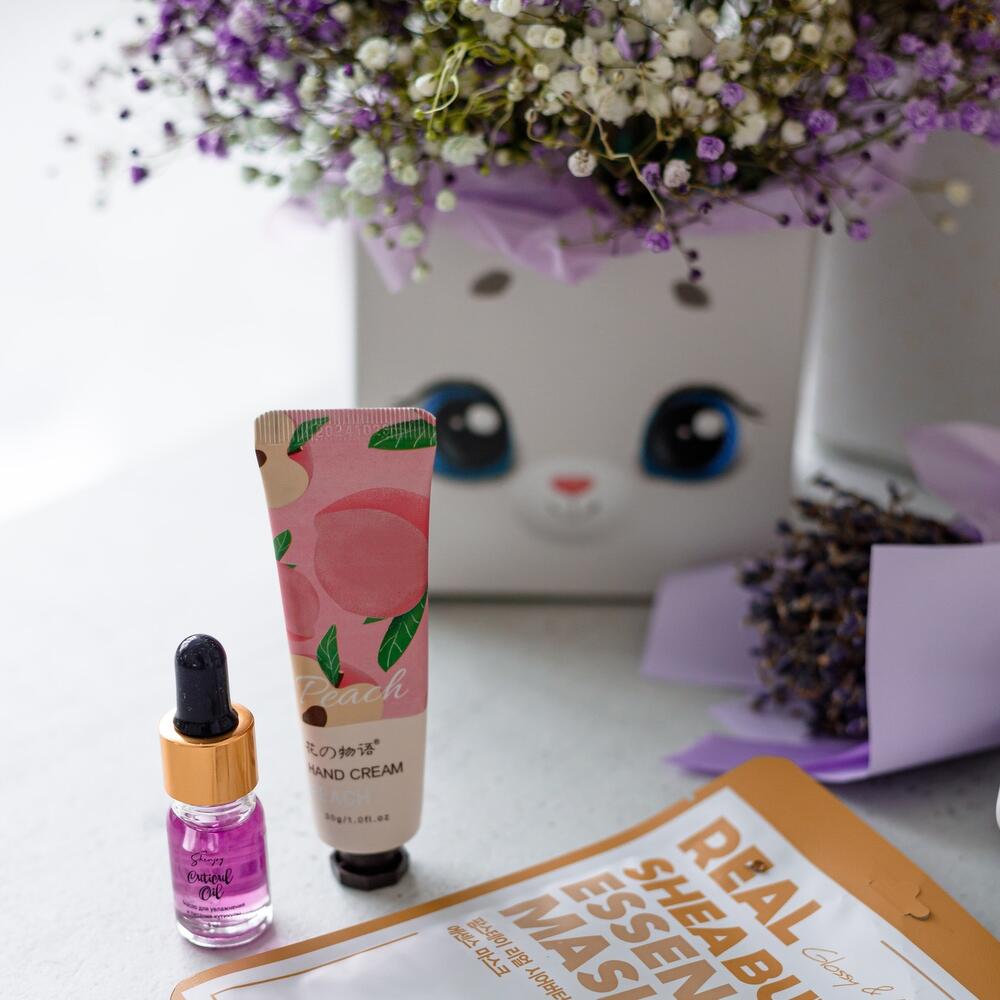 Гипсофила – 5 шт.коробка зайка – 1 шт.Тишью – 4 шт.Оазис флористический – 1 шт.маска для лица корея farm stay – 1 шт.Крем для рук – 1 шт.масло для кутикулы – 1 шт.бомбочки для ванной набор – 1 шт.Коробка подарочная – 1 шт.Наполнитель бумажный – 1 шт.Лента атласная – 1 шт.Упаковка транспортировочная пленка – 1 шт.инструкция по уходу за цветами – 1 шт.букет лаванда – 1 шт.
